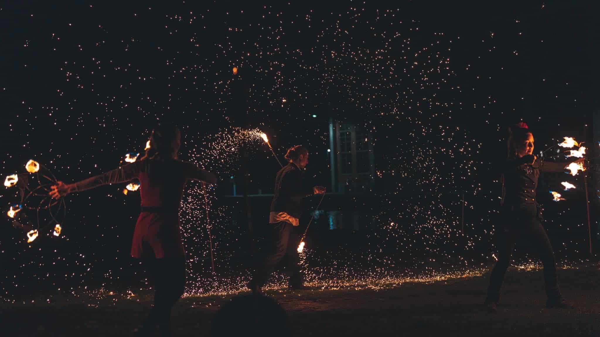 Eldshowen framförs med deltagare från CirkusStudion tillsammans med professionella eldkonstnärer.