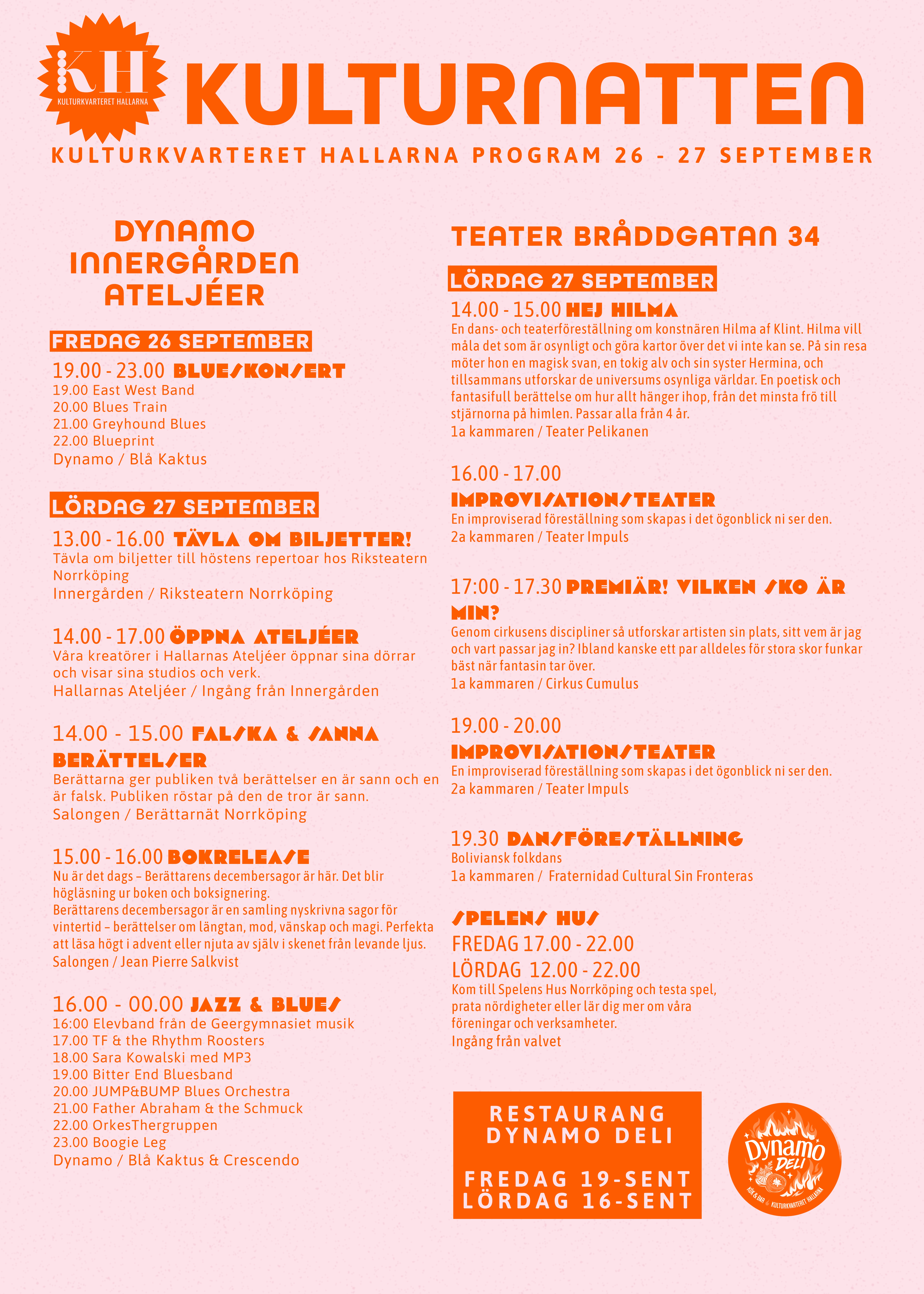 Välkommen till en sprudlande Kulturnatt i hjärtat av Norrköping! I Kulturkvarteret Hallarna kan du uppleva allt från dans och berättarteater, till musik, cirkus och öppna ateljéer. Lyssna på livemusik från lokala band, och nationella akter, möt konstnärer i deras kreativa rum och låt dig överraskas av improvisationsteater och boliviansk dans. Här finns något för hela familjen – från sagostund för de yngsta till nattliga rytmer för de musikälskande.