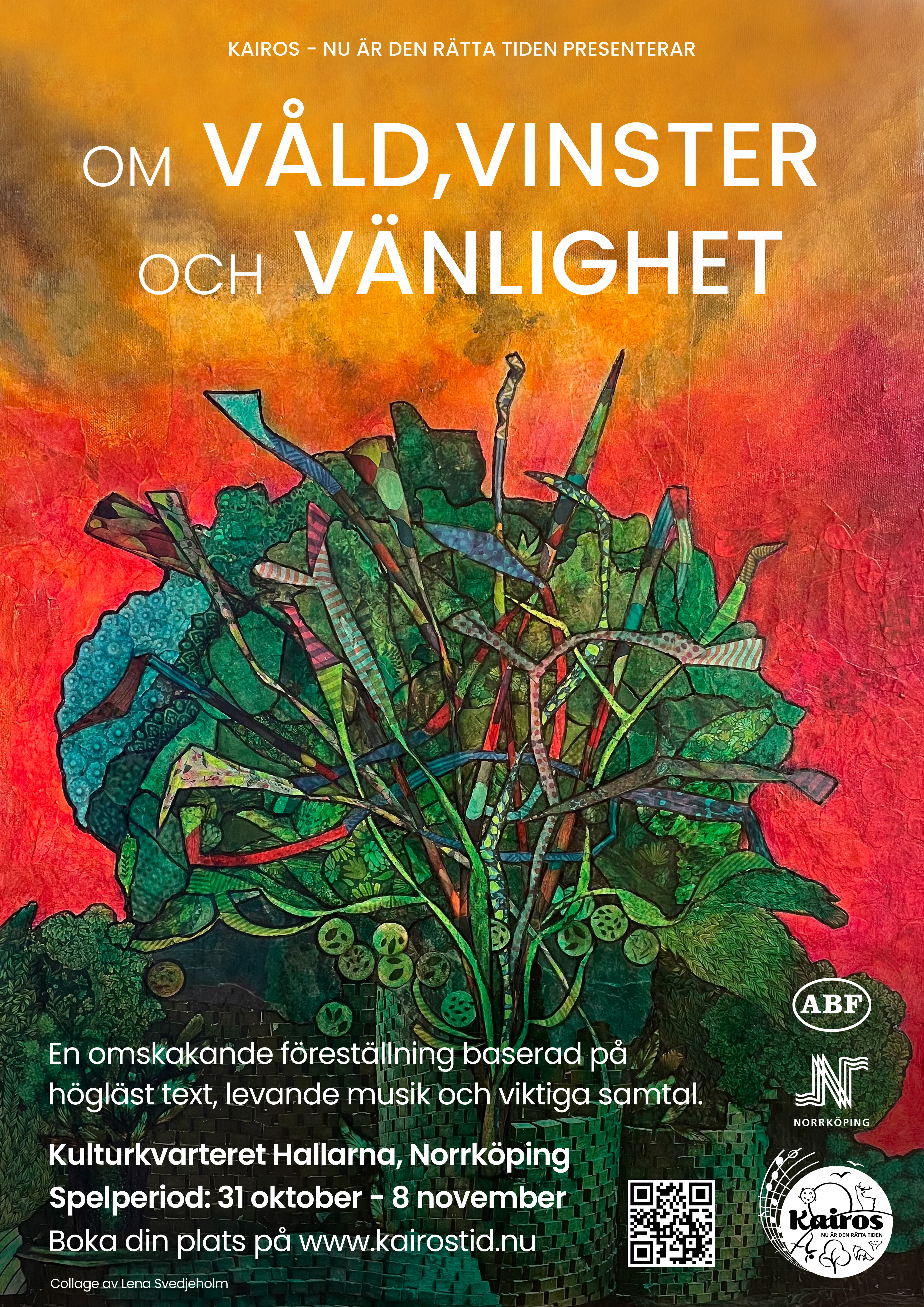 Scenkonstföreningen “Kairos – nu är den rätta tiden” utforskar olika former av scenkonst och musikteater i kollektiva, konstnärliga processer, samtidigt som vi ställer frågor om samtiden och om vilket samhälle vi vill ha och behöver framöver. På våren 2024 kom vi i kontakt med Julia Romanovska som i arbetet med en doktorsavhandling inom ledarskapsutveckling ställt chefer och ledare inför intensiva konstupplevelser baserade på högläst text, musik och samtal. Cheferna som deltog kom att radikalt ompröva sin självbild och världsbild. Tyngdpunkten i ledarskapet försköts från utövande av makt till ökat ansvarstagande och mod att ta ställning baserat på etiska överväganden. Med Kairos föreställning “Om våld, vinster och vänlighet” vill vi utforska om känslomässigt omtumlande, konstnärliga upplevelser kan stärka etiska ställningstaganden inte bara hos ledare utan hos vem som helst. Skulle vi, och andra till synes maktlösa personer, kunna bli modigare och mer ansvarskrävande gentemot människor med makt och inflytande? Skulle vi må bättre om vi vågade mer?