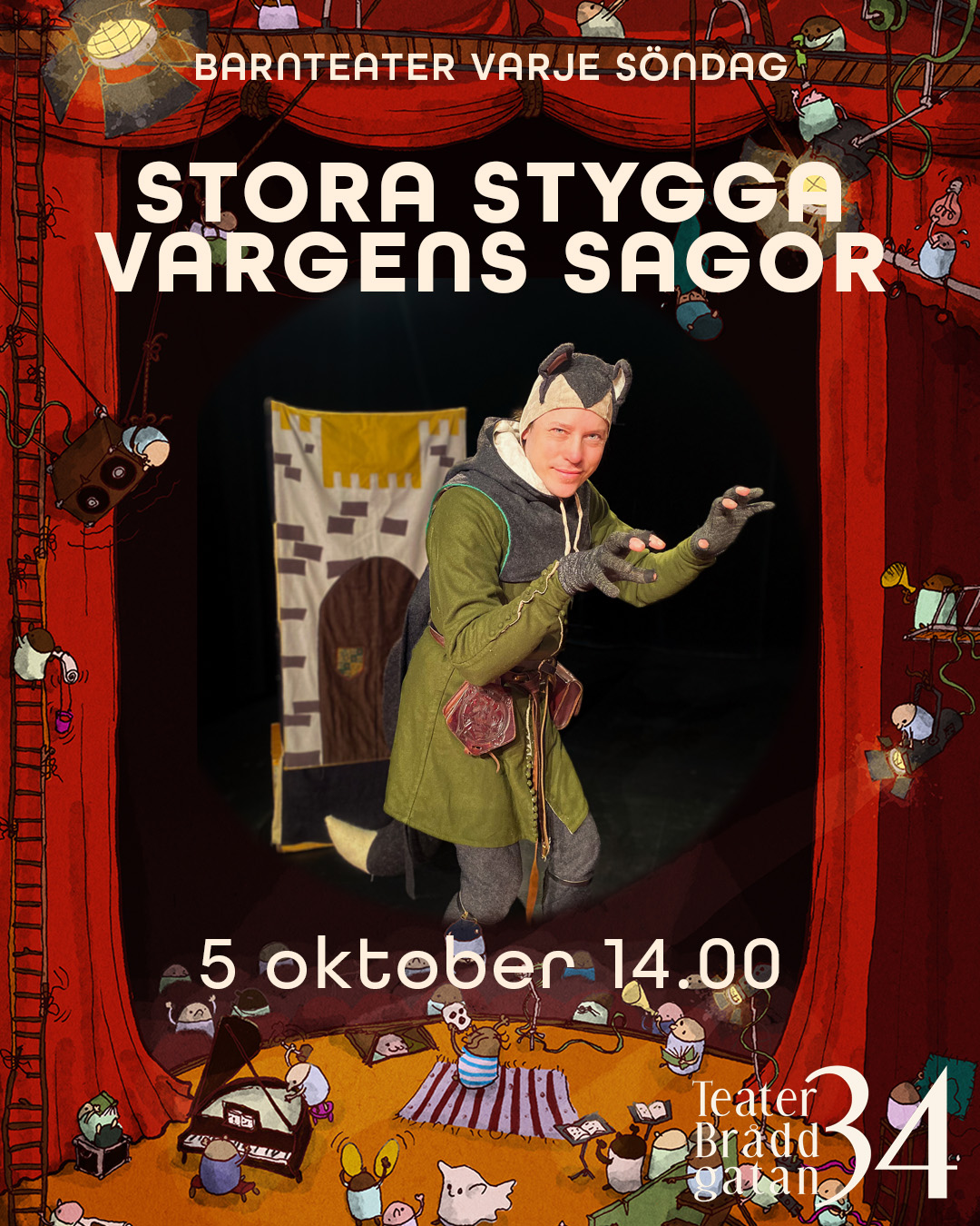 Är vargen alltid så farlig som i sagorna? Här får publiken möta den stora stygga vargen själv, som med glimten i ögat berättar sin egen version av de klassiska berättelserna. En rolig och spännande föreställning som lockar till både skratt och eftertanke. Efteråt får barnen skapa sina egna vargmasker och kliva in i sagornas värld.