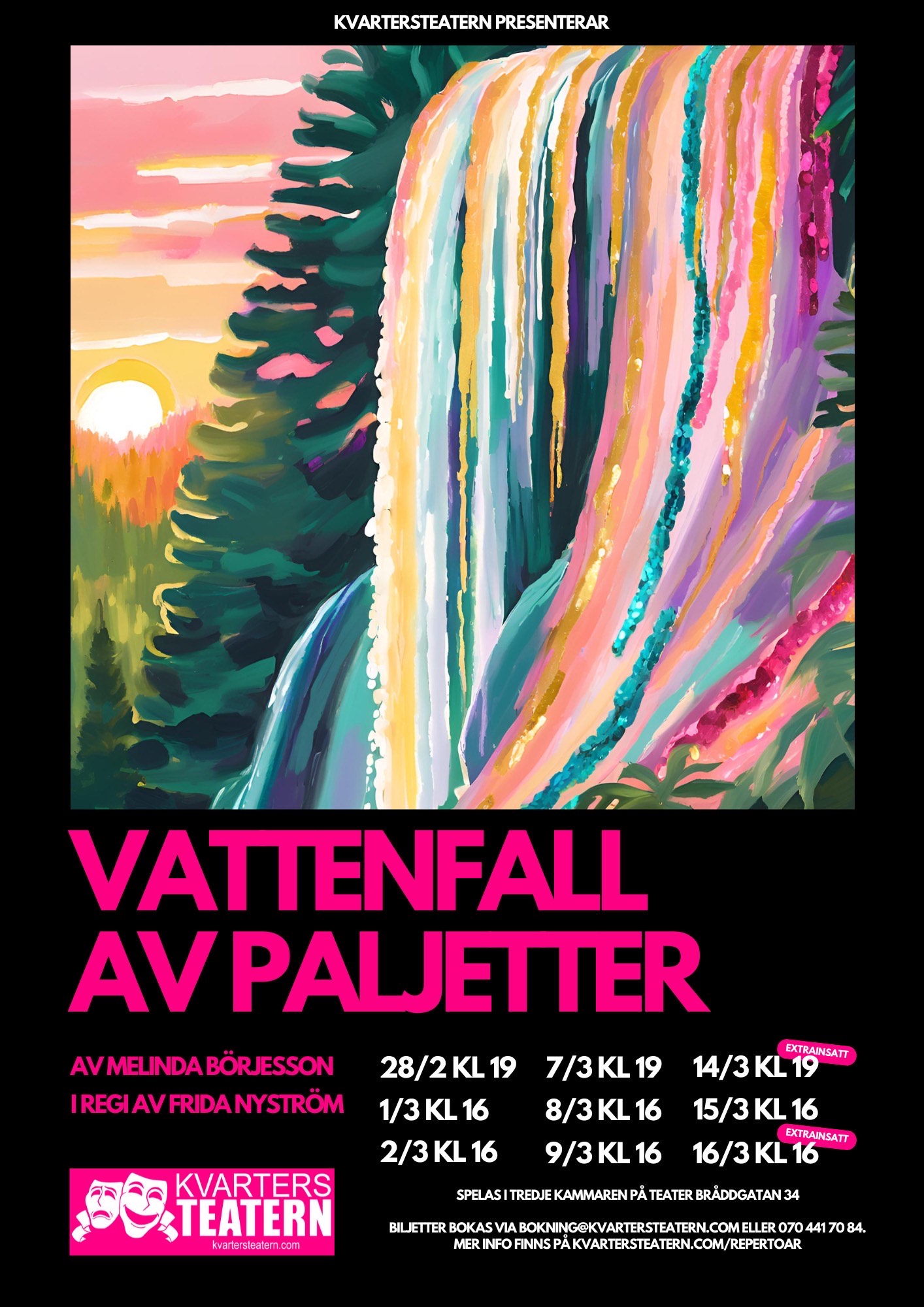 Kvartersteaterns medlem Melinda Börjesson följer upp sin fantastiska debut För Barnens Skull med ett nytt, gripande drama som får urpremiär i 3e kammaren i februari 2025! Vi är otroligt glada och stolta över att kunna presentera Vattenfall av Paljetter, en berättelse om vad som händer när man inte tillåts vara den man är. Vi följer Viveka, en äldre kvinna som inte är nöjd med hur livet blev. Hon trivs inte med sin make Bernt och verkar inte uppskatta att dottern Cecilia har tagit tjänstledigt för att följa sina drömmar om att bli konstnär, och dessutom blivit kär i en kvinna. I början av pjäsen framstår Viveka som en riktig “surkärring” men genom tillbakablickar på hennes liv får vi förståelse för varför det är något som skaver och vad hon själv egentligen längtade efter.