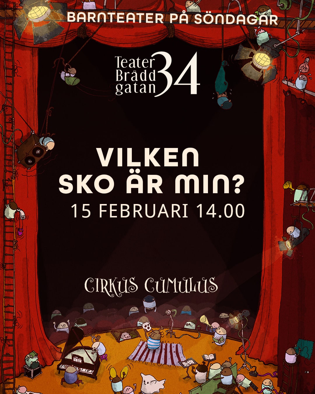 Teater Bråddgatan 34 Bråddgatan 34, NorrköpingBarnteater - Vilken sko är min? Med kroppen som verktyg och cirkusens discipliner som språk utforskar artisten en av livets stora frågor: Vem är jag, och var passar jag in? I ett färgsprakande möte mellan handstående, rockringar, Washington-trapets och fantasi, bjuds publiken in i en lekfull resa där varje sko symboliserar en ny möjlighet [...]