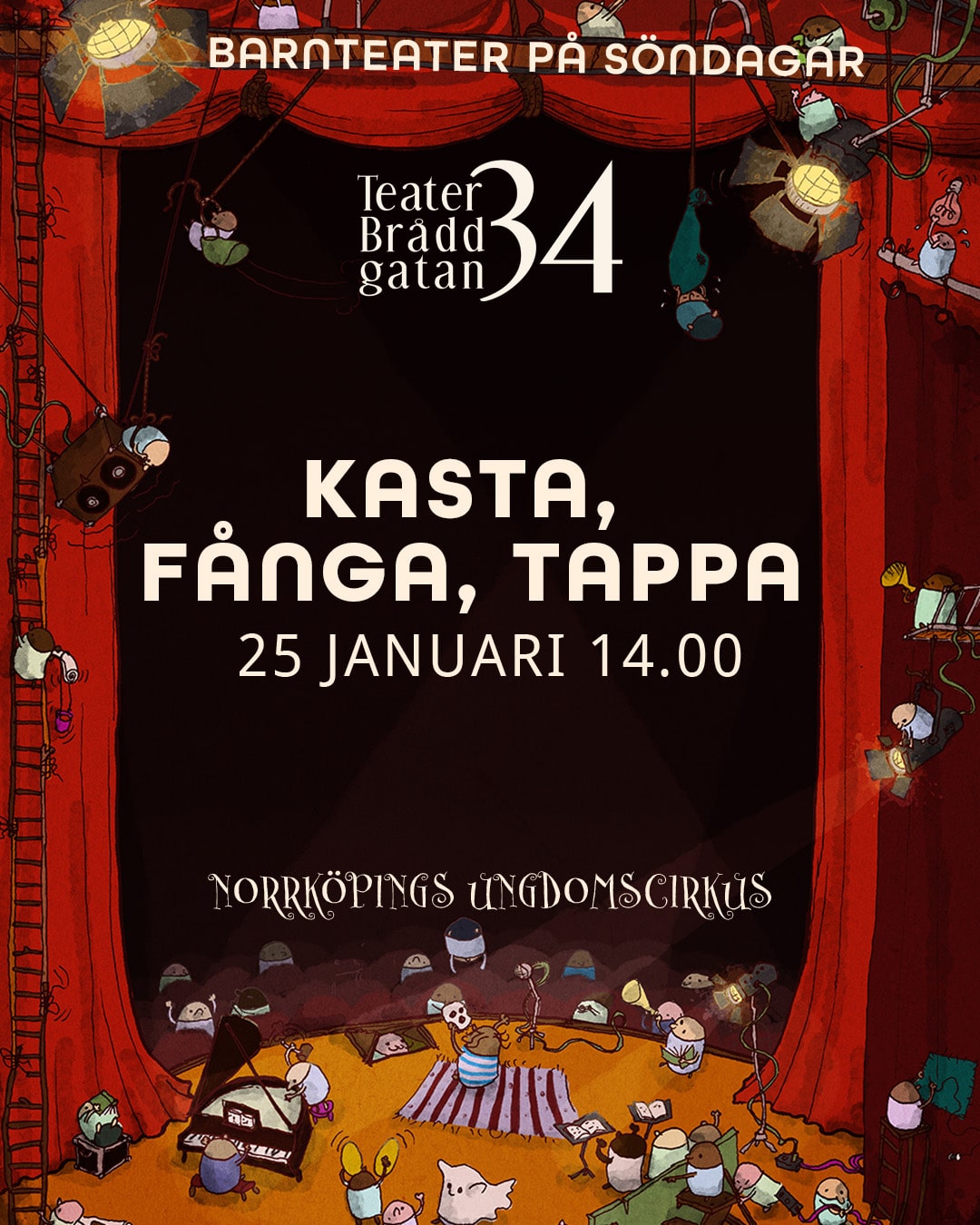 Teater Bråddgatan 34 Bråddgatan 34, NorrköpingBarnteater - Kasta, Fånga, Tappa I den här föreställningen är cirkus mer än trick och teknik.Genom att kasta, fånga och samarbeta berättas en historia om tillit, trygghet och mod.Om hur det känns att våga lita på någon annan – i luften och på marken –och hur man tillsammans kan våga mer än man klarar [...]