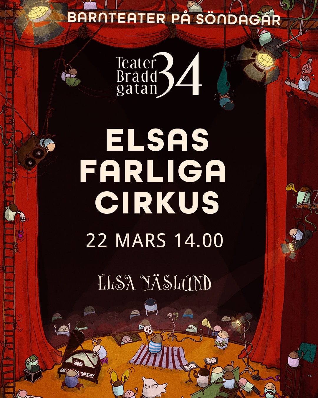 Teater Bråddgatan 34 Bråddgatan 34, NorrköpingELSAS FARLIGA CIRKUS Minns ni Elsas Flygande Cirkus? Cirkusartisten Elsa Näslund är nu tillbaka och bjuder den här gången på Elsas Farliga Cirkus. En cirkusshow med humor och akrobatik med full fart och fläkt. En spännande one woman show som innehåller det mesta i cirkusväg. Rekommenderad ålder: Hela familjen Dörrarna till Teater Bråddgatan 34 [...]