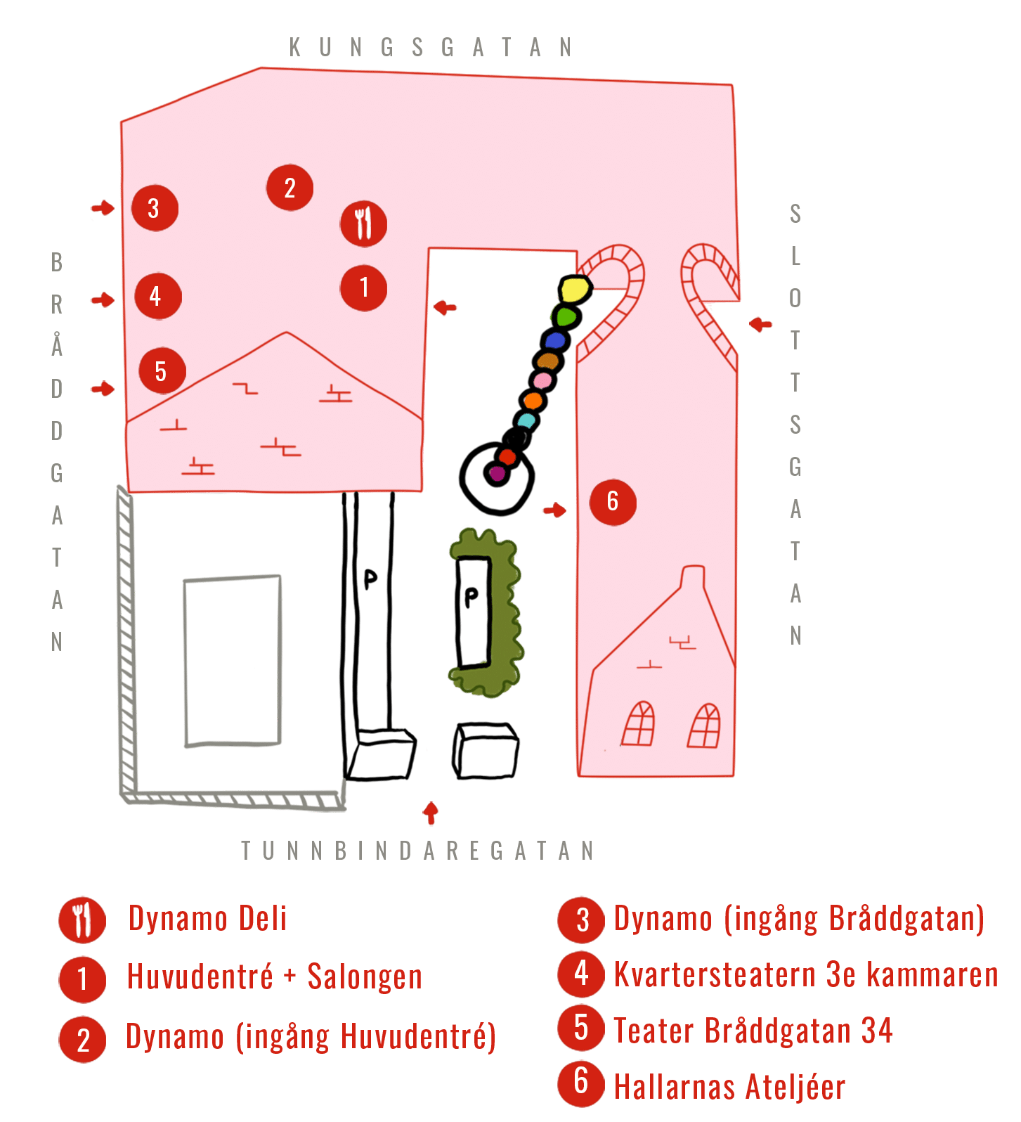 Hallarna ligger i centrala Norrköping, utmed Kungsgatan, en av stadens huvudgator. Ingångarna finns mot de mindre gatorna Slottsgatan, Bråddgatan och Tunnbindaregatan. Det är 5 minuters promenad från resecentrum med tågstation och långdistansbussar och 3 minuter från närmsta buss/spårvagnshållplats (Norr Tull). Gatuparkering mot avgift finns det gott om i kvarteren runt Hallarna.